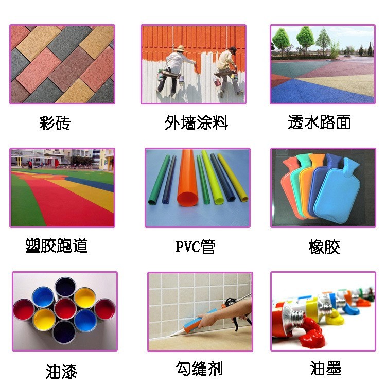 用途:造漆、油墨、绘画、颜料和蜡笔,涂饰漆布、漆纸、塑料制品着色,建筑地面、地砖等着色。